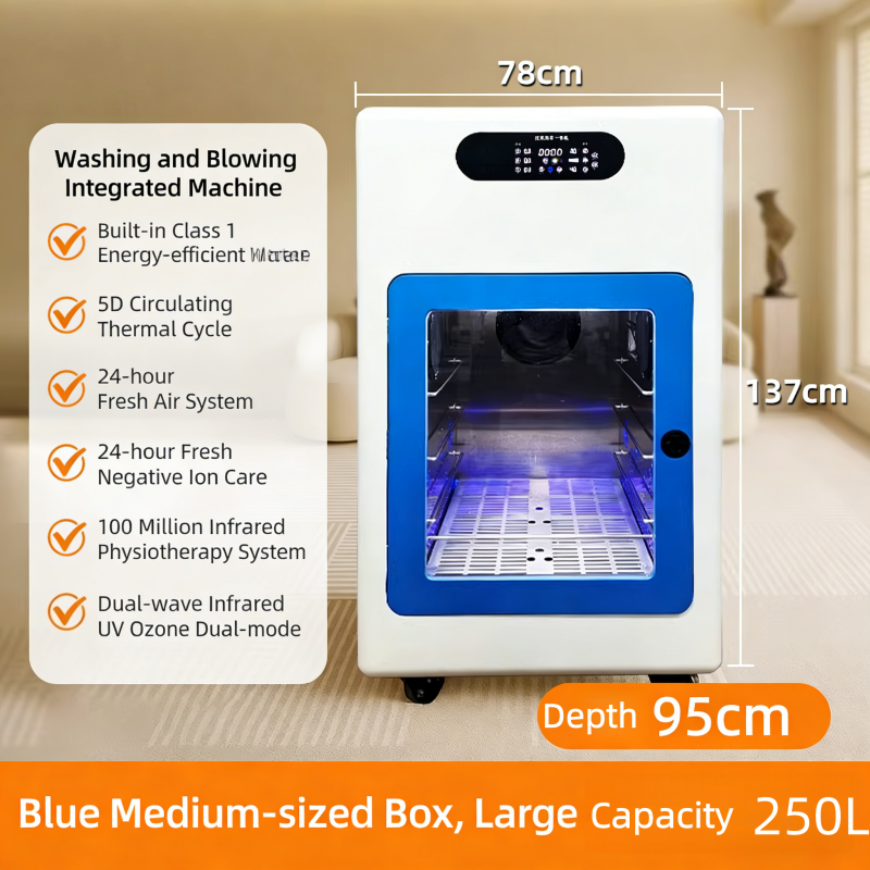 Un ventilateur ultra-silencieux renouvelle l'air 12 fois par heure et injecte 100 millions d'ions négatifs par centimètre cube. L'électricité statique, les odeurs et les pellicules sont neutralisées, laissant le pelage doux, brillant et prêt pour le brossage final. - Quatre tailles, aucune approximation