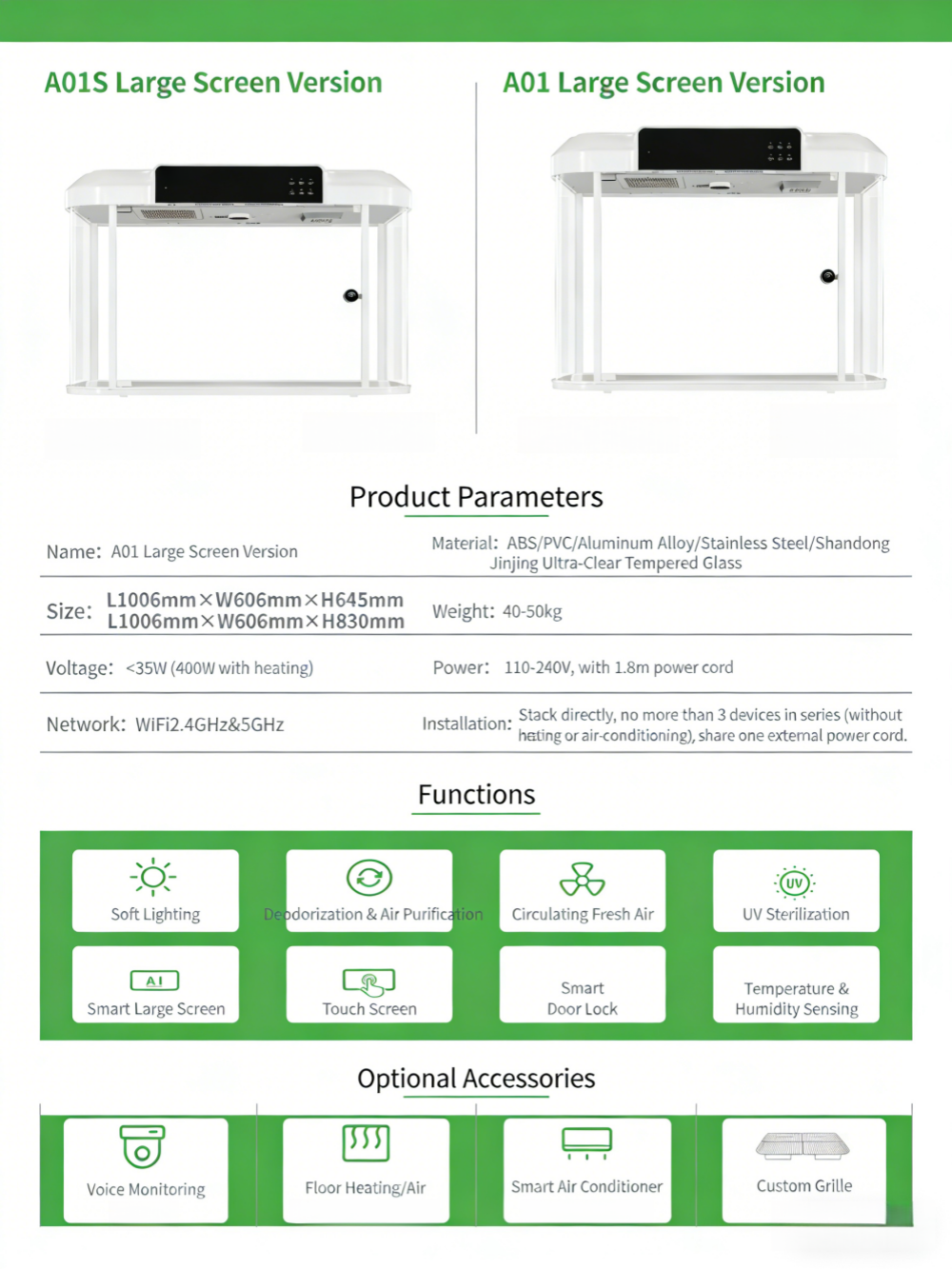 La niche intelligente pour chat USMILEPET UP-A01 est disponible en deux tailles grand écran : A01S (1006 × 606 × 645 mm) et A01 (1006 × 606 × 830 mm). Fabriquée à partir de matériaux résistants, cette niche est équipée d’un éclairage doux, d’un système de désodorisation, d’une stérilisation UV, d’un écran tactile et de capteurs de température et d’humidité. Elle propose également, en option, la surveillance vocale et le chauffage. Empilable, compatible 110-240 V et dotée du Wi-Fi, elle est expédiée dans le monde entier (DDP/DAP/FOB/FCA). Pour plus d’informations, veuillez contacter le +86 18340808278 ou l’adresse usmilesupply@yeah.net.