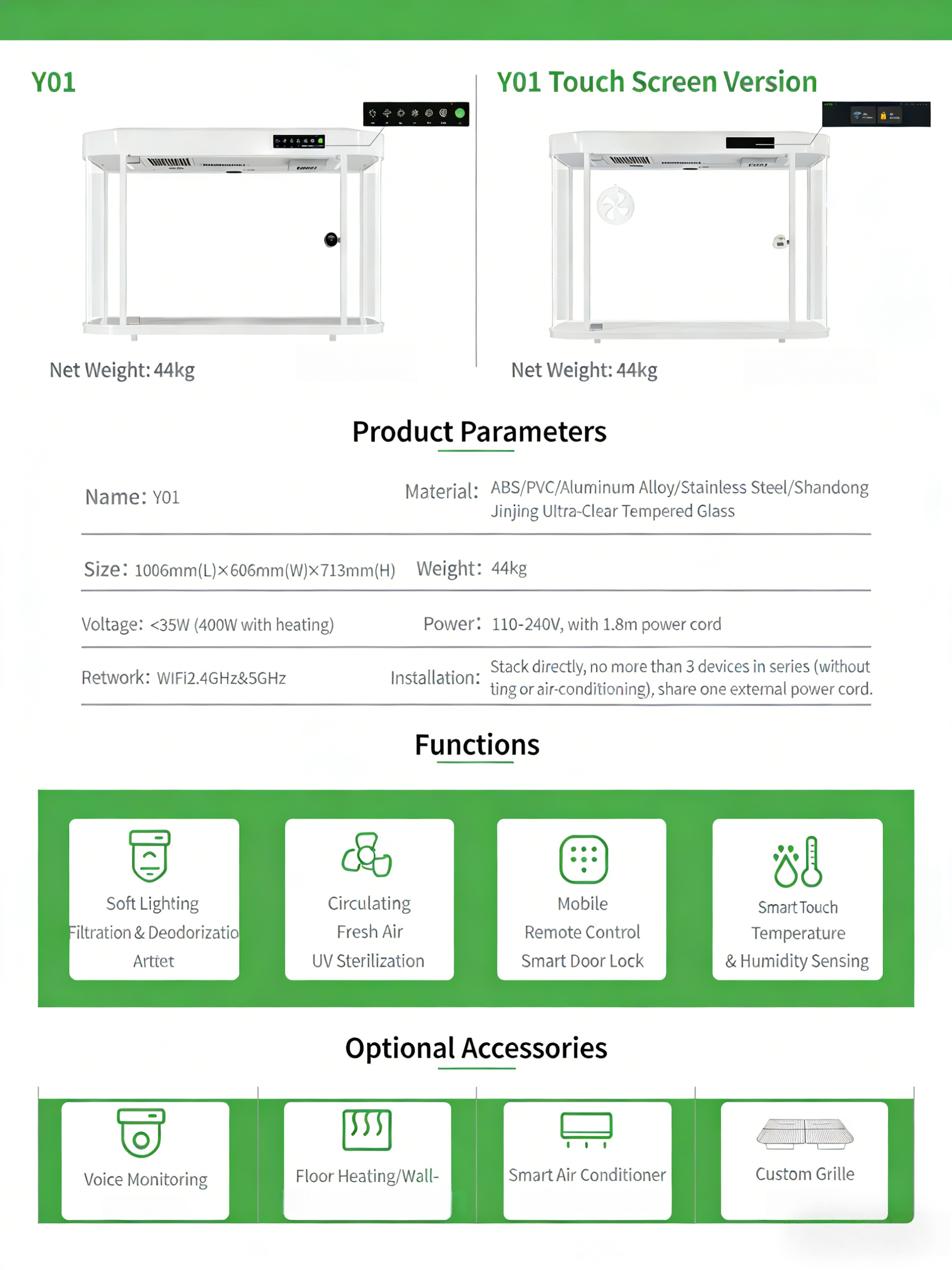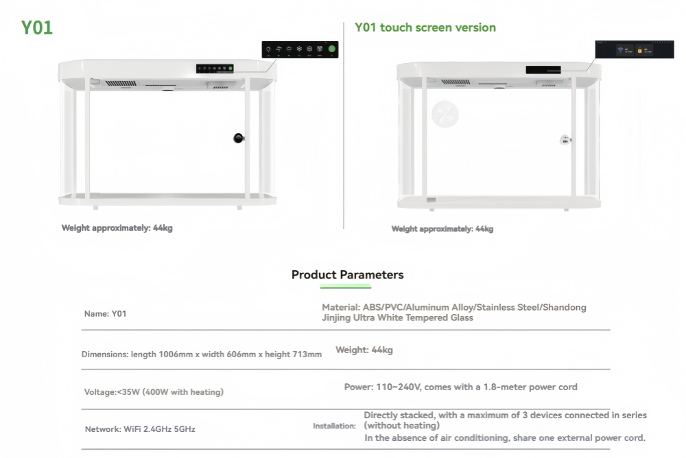 Fabriqué à partir d'un mélange robuste d'ABS, de PVC, d'alliage d'aluminium, d'acier inoxydable et de verre trempé ultra-clair de haute qualité Shandong Jingjing, le UP-Y01 mesure 1006 mm de longueur, 606 mm de largeur et 713 mm de hauteur, avec un poids net de 44 kg.Cette niche intelligente pour animaux de compagnie est compatible avec le Wi-Fi double bande (2,4 GHz et 5 GHz) et une alimentation électrique universelle de 110 à 240 V. Sa faible consommation en veille est inférieure à 35 W (400 W avec le chauffage activé). Empilable, elle permet de connecter jusqu'à 3 unités en série (sans chauffage ni climatisation), ce qui la rend idéale pour les foyers avec plusieurs animaux.