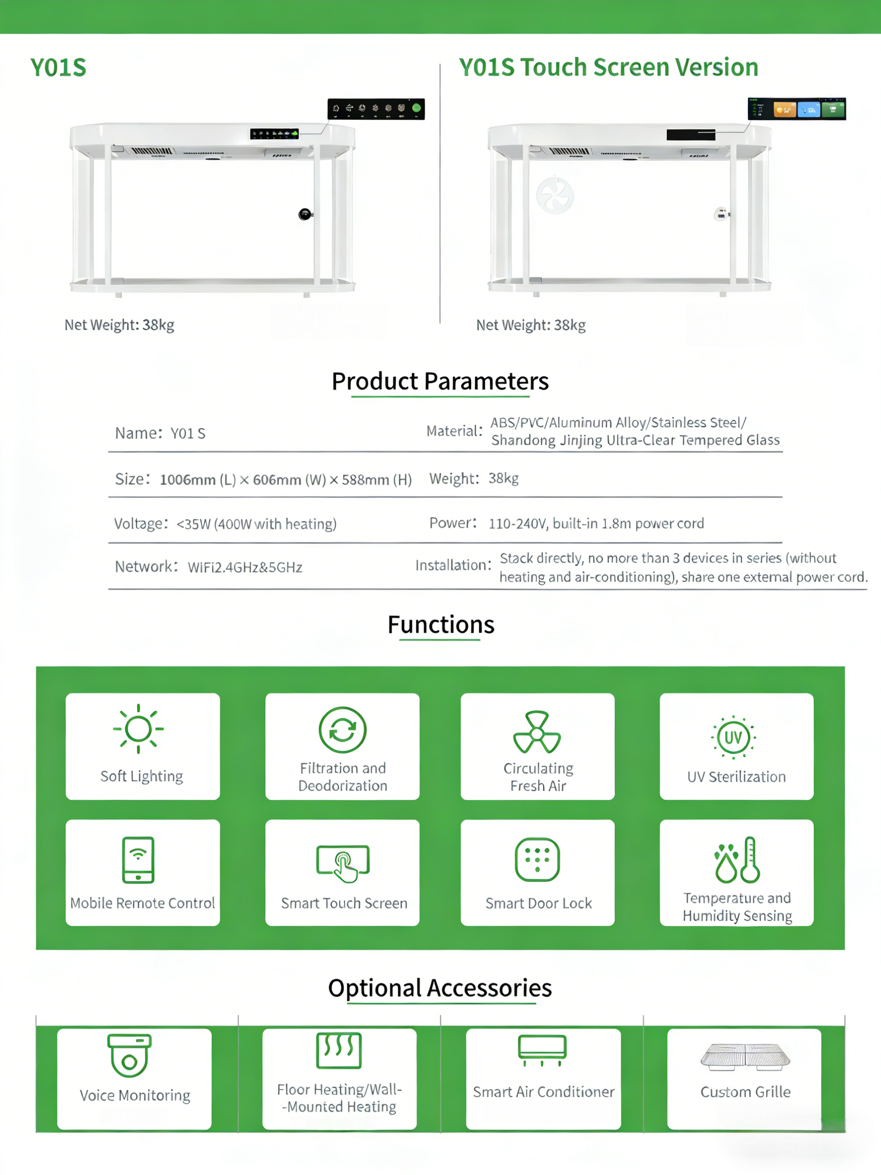Fabriquée à partir d'un mélange robuste d'ABS, de PVC, d'alliage d'aluminium, d'acier inoxydable et de verre trempé ultra-clair de haute qualité de Shandong Jingjing, la niche UP-Y01S mesure 650 mm de long, 450 mm de large et 450 mm de haut, pour un poids net de 25 kg. Cette niche intelligente pour animaux de compagnie est compatible avec le Wi-Fi double bande (2,4 GHz et 5 GHz) et fonctionne sur une alimentation électrique universelle de 110 à 240 V. Sa faible consommation en veille est inférieure à 35 W (400 W avec le chauffage activé). Grâce à sa conception empilable, il est possible de connecter jusqu'à 3 unités en série (sans chauffage ni climatisation), ce qui la rend idéale pour les foyers avec plusieurs animaux ou les salons de toilettage.